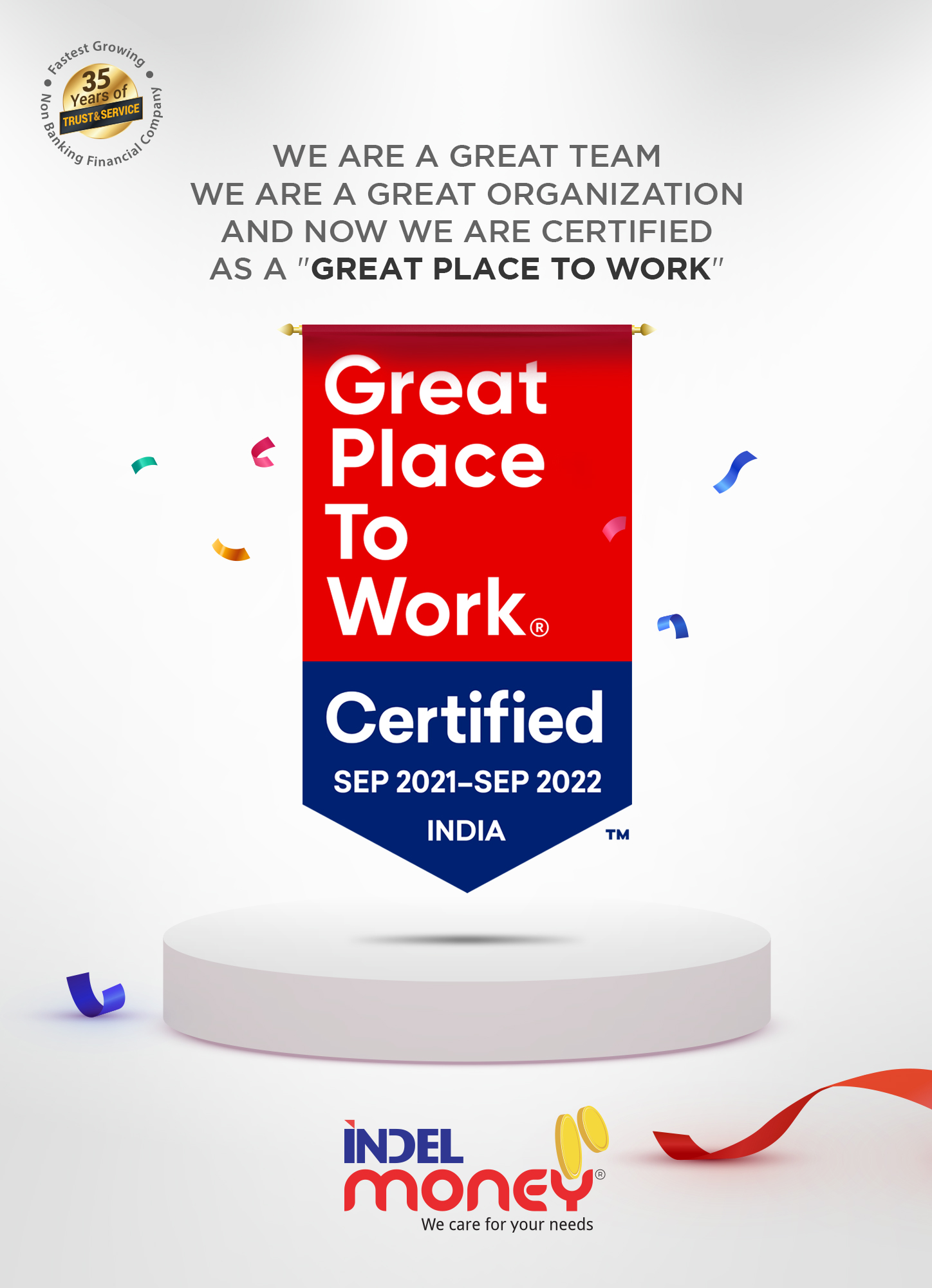 Every year, more than 10,000 organizations from over 60 countries partner with Great Place to Work® Institute for assessment, benchmarking, and planning actions to strengthen their workplace culture. Great Place to Work® Institute’s methodology is recognized as rigorous and objective and is considered the gold standard for defining great workplaces across business, academia, and government organizations. Great Place to Work® Certification Program is the first step for an organization in its journey to build a High-Trust, High-Performance Culture™, and INDEL MONEY has successfully accomplished this milestone. Great Place to Work® Trust Index© Employee Survey is the world’s most widely used model to understand employee perceptions about their workplace. As part of this assessment, the Great Place to Work® Institute measured the perceptions of the employees using the Great Place to Work® Trust Index© Employee Survey and understood INDEL MONEY’s differentiating culture through the Culture Brief© and Culture Audit©. The online survey was attempted by more than 500 selected employees from different States. Increase in Great Place to Work® Trust Index© Score positively impacts productivity, innovation, costs, and other business results.